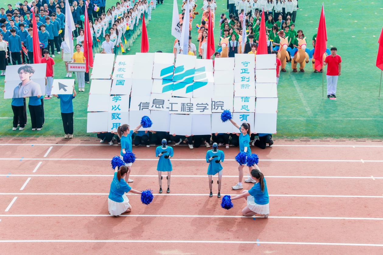 运动会开幕式现场,信息工程学院方阵迈着整齐步伐,昂首走过主席台。队形变换间,校徽与院徽依次呈现,校训与院训铿锵有力、响彻全场。展演中,机器人与舞蹈队员灵动登场,创意十足、青春飞扬,成为开幕式上一道亮丽的风景线,赢得全场阵阵掌声。