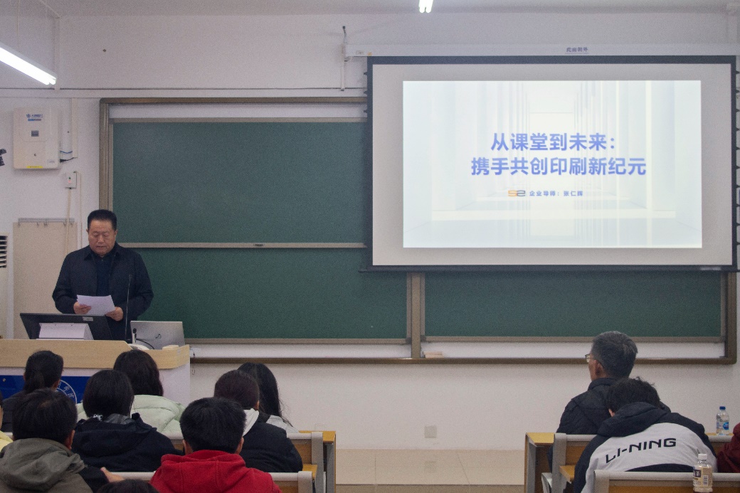 河北新华第二印刷有限公司企业导师张仁辉以“从课堂到未来:携手共创印刷新纪元”为题,为师生带来一场内容丰富的分享。结合企业的发展历程,张仁辉通过实例与数据,回顾印刷业从“铅与火”、“光与电”到“数与智”的变迁,介绍公司作为国家级书刊印刷定点单位的成就,阐述行业“绿色化、数字化、智能化、融合化”趋势及企业数智转型实践,指出行业亟需四类关键人才。他引用行业发展理念寄语新生,鼓励大家扎根专业、勇于实践,成长为复合型人才,投身印刷业,为行业高质量发展、文化传播贡献力量。