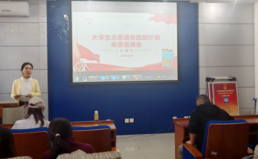 刘美琪介绍本次宣讲会举办的目的和意义,向同学们介绍“什么是西部计划”,引导同学们积极响应团中央“到西部去,到基层去,到祖国最需要的地方去”的号召,将个人成长与祖国需要紧密结合,用实际行动服务于西部基层建设。