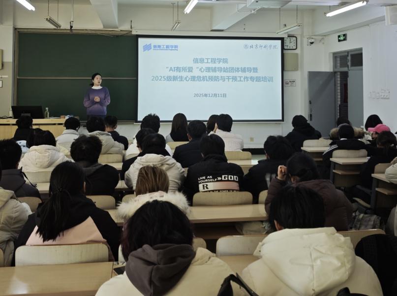 为推进学院2025级新生引航工程建设,加强“三观三感”教育和大学生心理健康教育,12月11日下午,学院在康庄校区举办“AI有所爱”心理辅导站团体辅导暨2025级学生骨干心理危机预防与干预工作专题培训。心理辅导员付雪琪,年级辅导员蒋祎,2025级全体班级学生骨干、宿舍长参加培训。